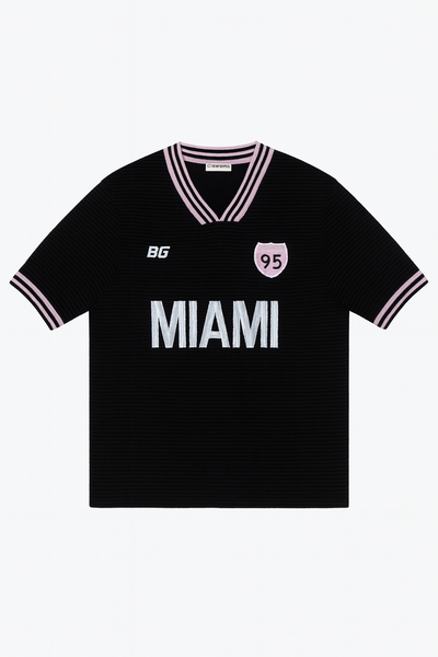 Embroidered Miami graphics in our bold colourways, make the perfect finishing detail for this casual knit football jersey.